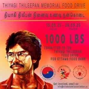 In September 2025, the Ottawa Tamil Association (OTA), Ottawa Tamil Cultural Society (OTACT), and OTACT Taekwondo jointly aim to collect over 1,000 lbs of non-perishable food items to donate to the Ottawa Food Bank as part of the Thiyagi Thileepan Memorial Food Drive. The Ottawa Tamil Association (OTA) expresses gratitude to all contributors for their support and is proud to continue this effort in its 6th year with your ongoing support.