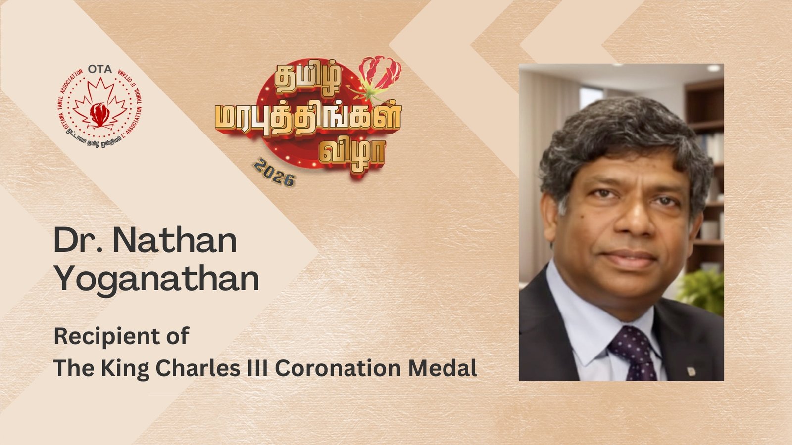 The Ottawa Tamil Association was honoured to support and coordinate the presentation of the King Charles III Coronation Medal to Dr. Nathan Yoganathan, in recognition of his outstanding contributions to public service, innovation, and community leadership. Established to commemorate the Coronation of King Charles III on May 6, 2023, this prestigious medal recognizes individuals who have made a meaningful and lasting impact on Canada and its communities.