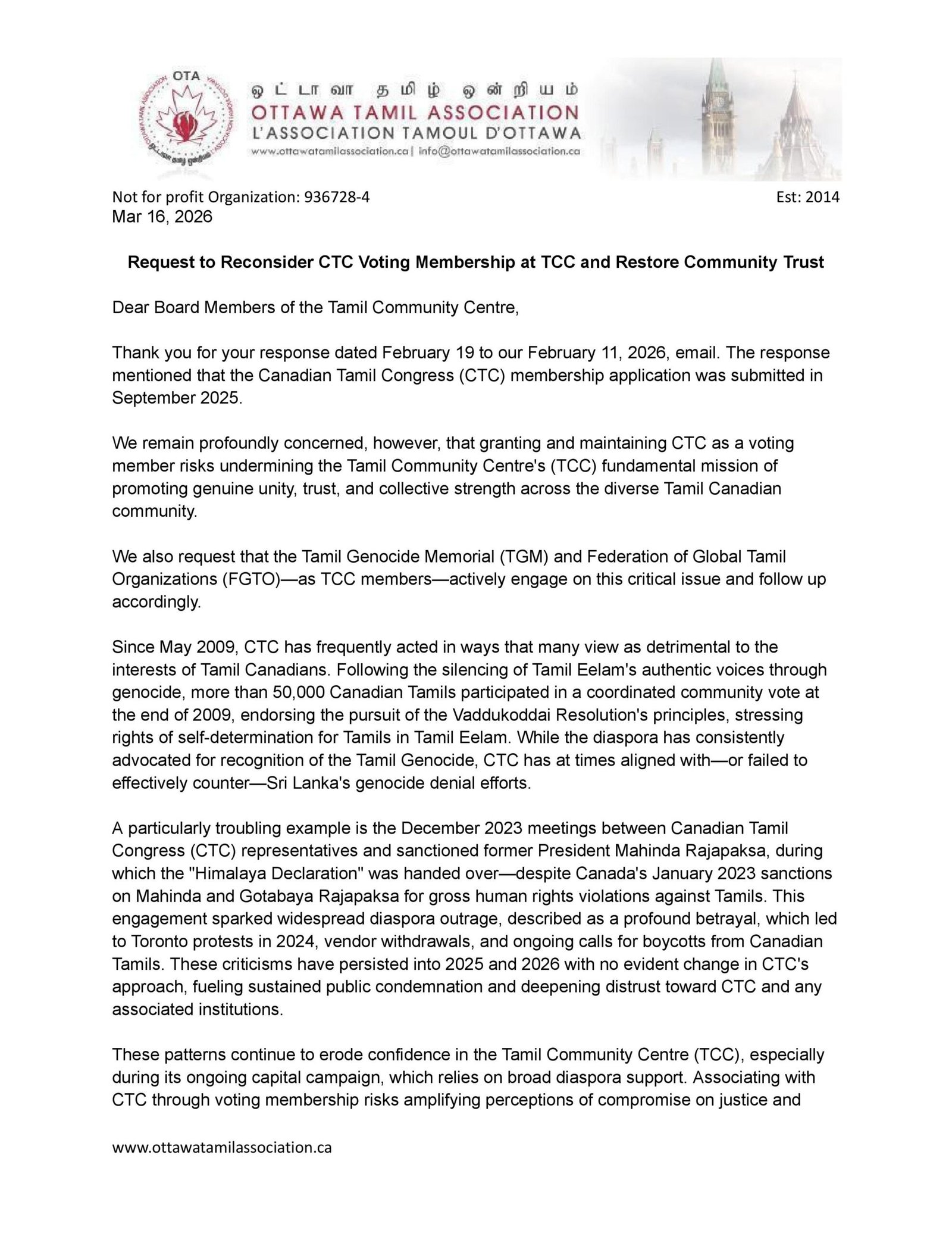 Thank you for your response dated February 19 to our February 11, 2026, email. The response mentioned that the Canadian Tamil Congress (CTC) membership application was submitted in September 2025.