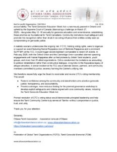 We remain profoundly concerned, however, that granting and maintaining CTC as a voting member risks undermining the Tamil Community Centre’s (TCC) fundamental mission of promoting genuine unity, trust, and collective strength across the diverse Tamil Canadian community.