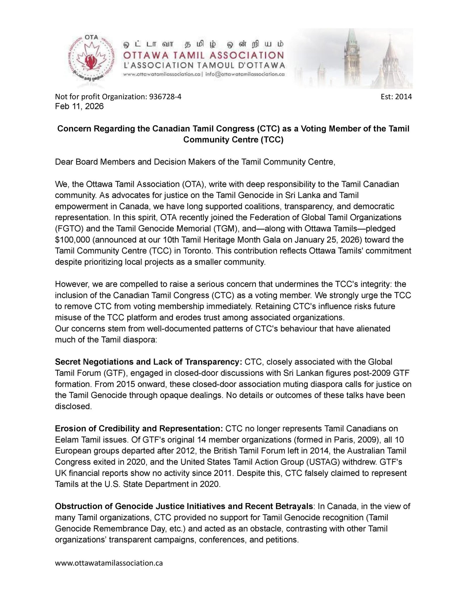 OTA sent the following letter to Tamil Community Center on Feb 11, 2026 PDF: Concern Regarding the Canadian Tamil Congress (CTC) as […]
